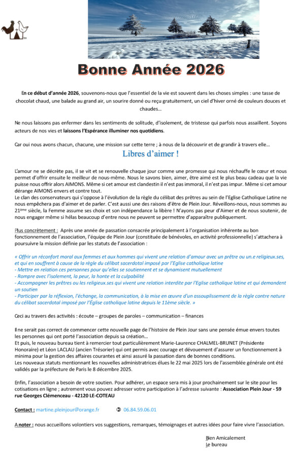 Plein Jour entend lutter avec d’autres contre cette règle inappropriée et dangereuse du célibat imposée à ceux qui veulent servir des communautés chrétiennes comme prêtres dans l’Eglise Catholique Romaine (ECR).